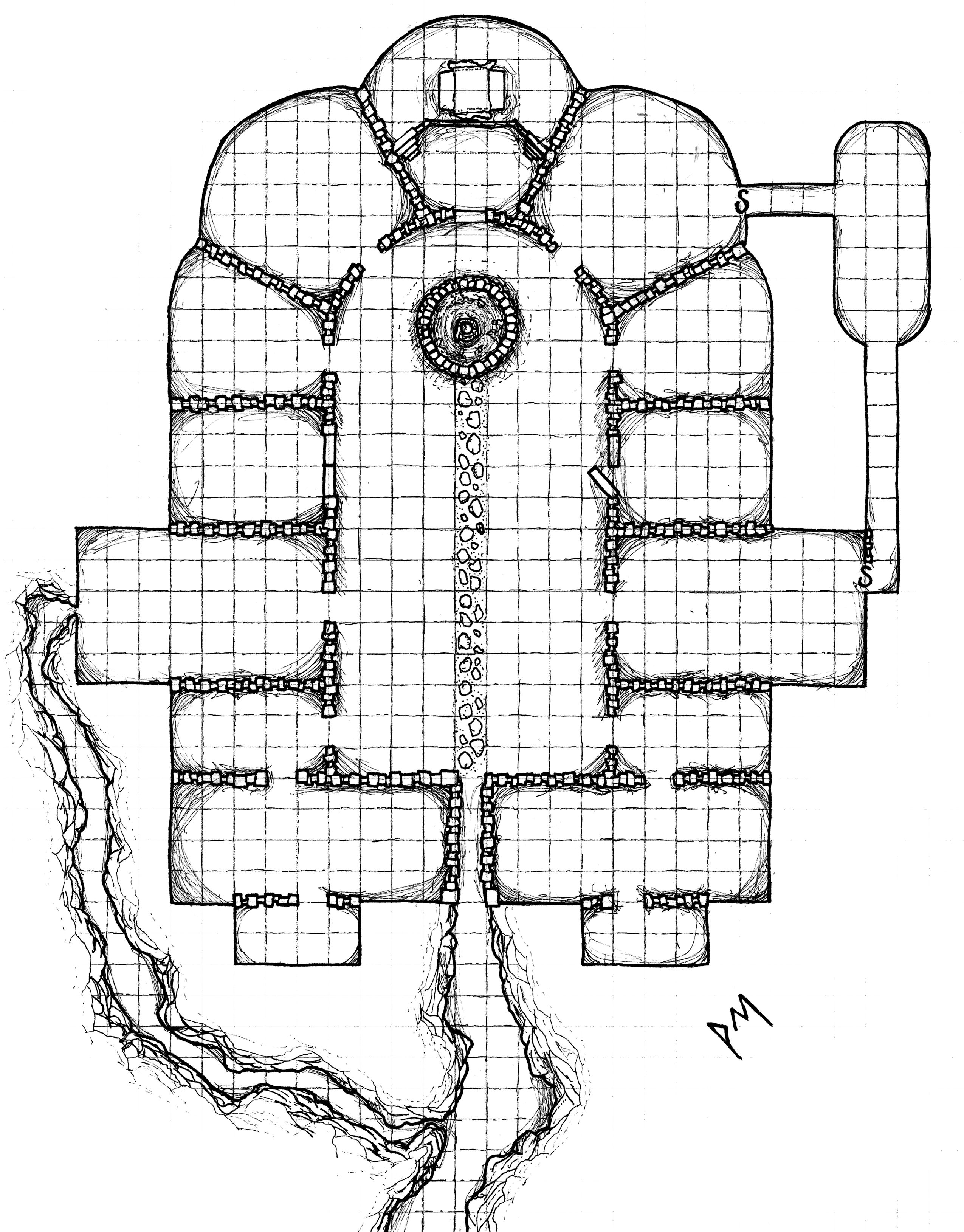 This map was actually an idea thought up by my wife, Nancy. She gave me a description of an underground temple, perhaps reached by going through a trapdoor in a witch’s cottage, in which rooms came off a large courtyard area that looked a little like a church window.